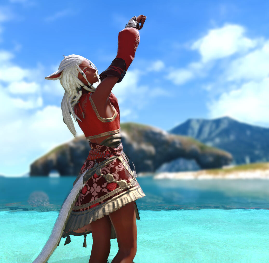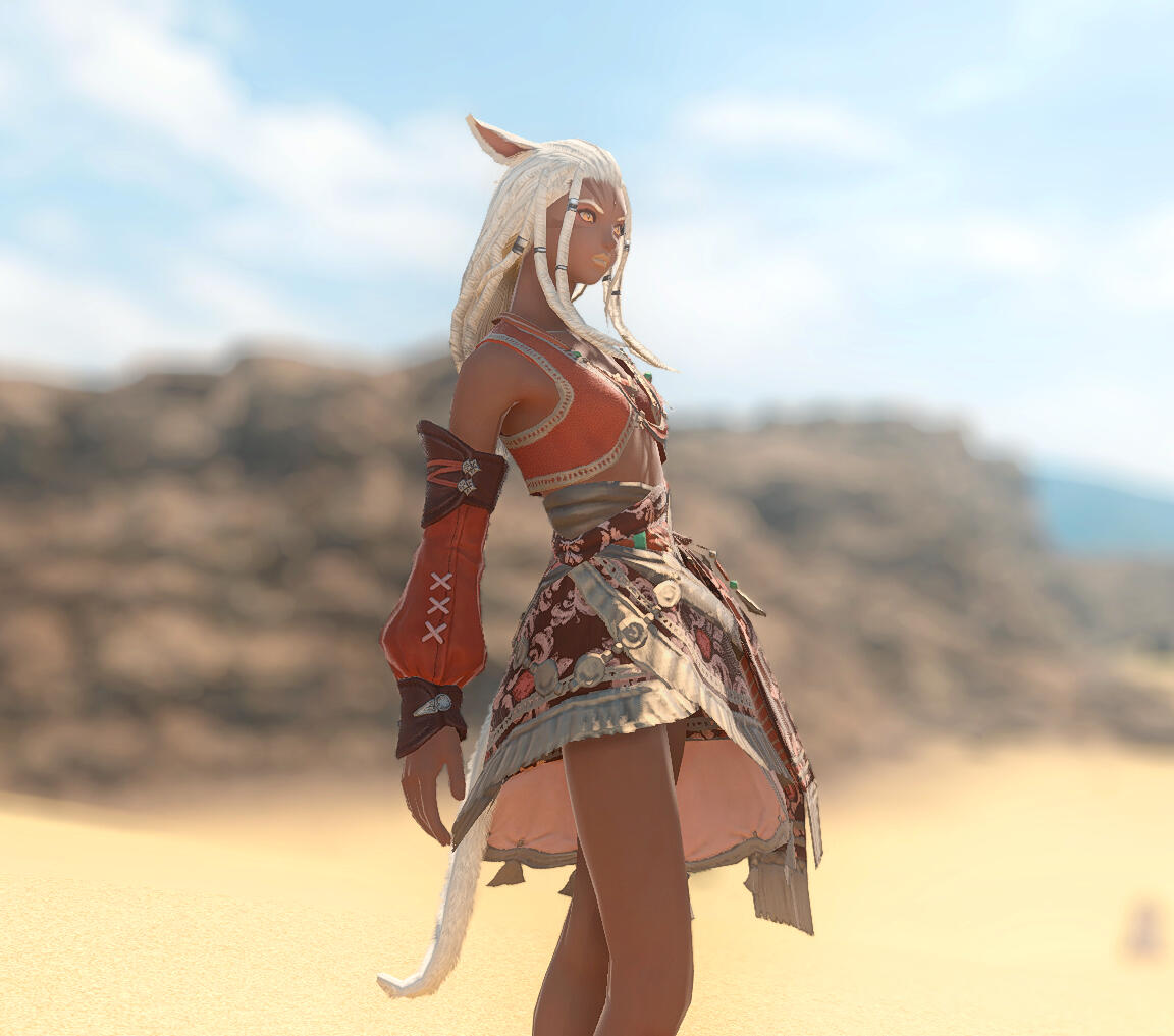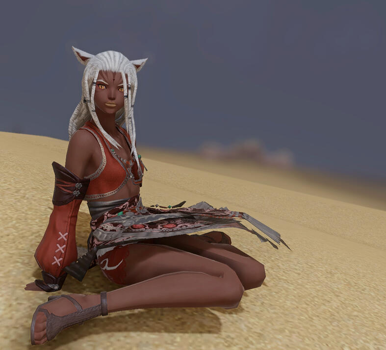 Uhmu, as a youngling, was born and raised in Ala Mhigo. But as a teen, things changed for her and her late family when the Empire overtook it. Retreating to the Thanalan deserts, she spends her teenage years as a thief in order to get food. At the beginning of her adulthood, she was finally caught when she made a huge mistake stealing in the city of Ul'dah. But out for some mere luck, one she tried to pickpocket gave mercy on her, saving her hide from the steel blades and offer her work. She gladly accepted out of relief. The man goes to teach her dancing but also teach her to defend herself without the use of blades or bows. When she good enough to fend on her own and financially stable enough, he decides to let her go. Offering her proper garments and weapons for her. Uhmu seeks to become a dancer trained by a Troupe but always has a home in the Angels.